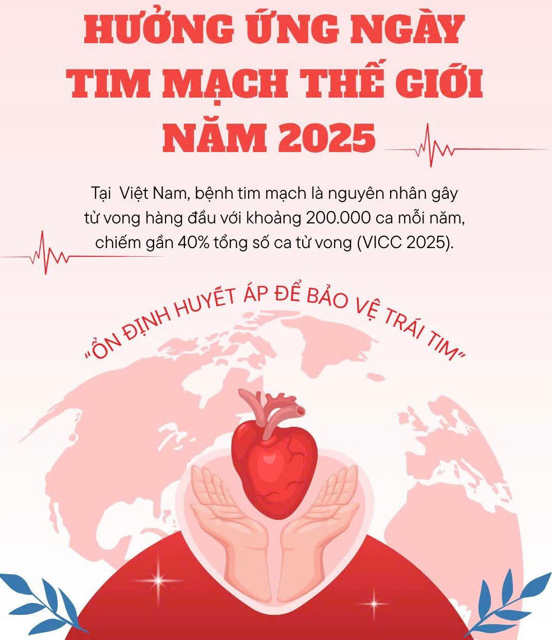 Tại Việt Nam,bệnh tim mạch là nguyên nhân gây tử vong hàng đầu với khoảng 200.000 ca mỗi năm, chiếm gần 40% tổng số ca tử vọng (VICC 2025). Tuy nhiên, 80% cơn đau tim và đột quỵ có thể phòng ngừa được nếu cộng đồng chung tay hành động vì một trái tim khỏe mạnh.Đáng chú ý, tỷ lệ mắc bệnh ngày càng trẻ hóa do lối sống ít vận động, chế độ ăn uống thiếu lành mạnh và căng thẳng kéo dài. Ngày 29/9 hằng năm được Liên đoàn Tim mạch Thế giới (World Heart Federation) phát động từ năm 2000 là Ngày Tim mạch Thế giới, nhằm nâng cao nhận thức cộng đồng và kêu gọi hành động phòng ngừa bệnh tim mạch.